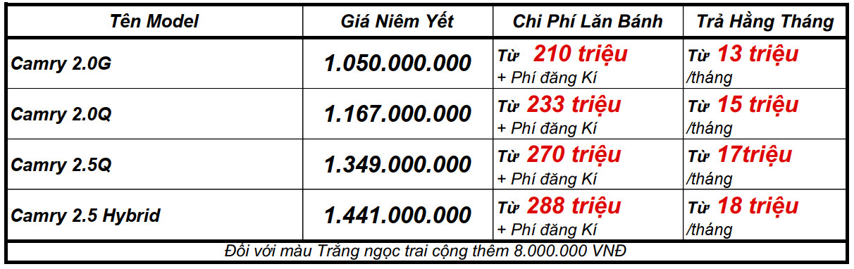 Toyota Camry có chi phí lăn bánh tại từng khu vực khác nhau. giá tạm tính như sau: